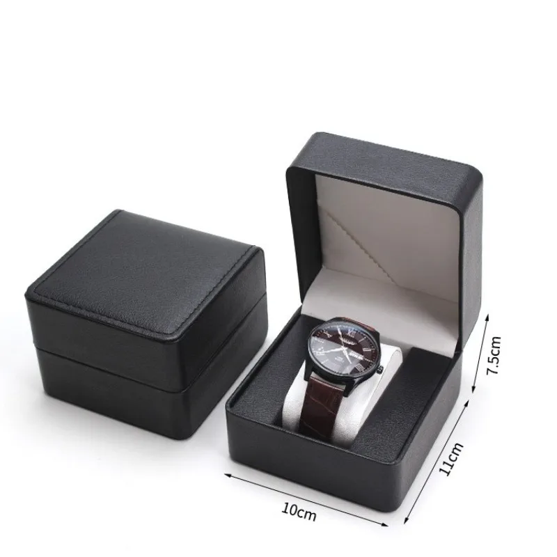 Keep your timepiece safe and stylishly stored with this premium watch box. Crafted with a sleek black leather-look exterior and a soft, cushioned interior, it provides both protection and sophistication.
